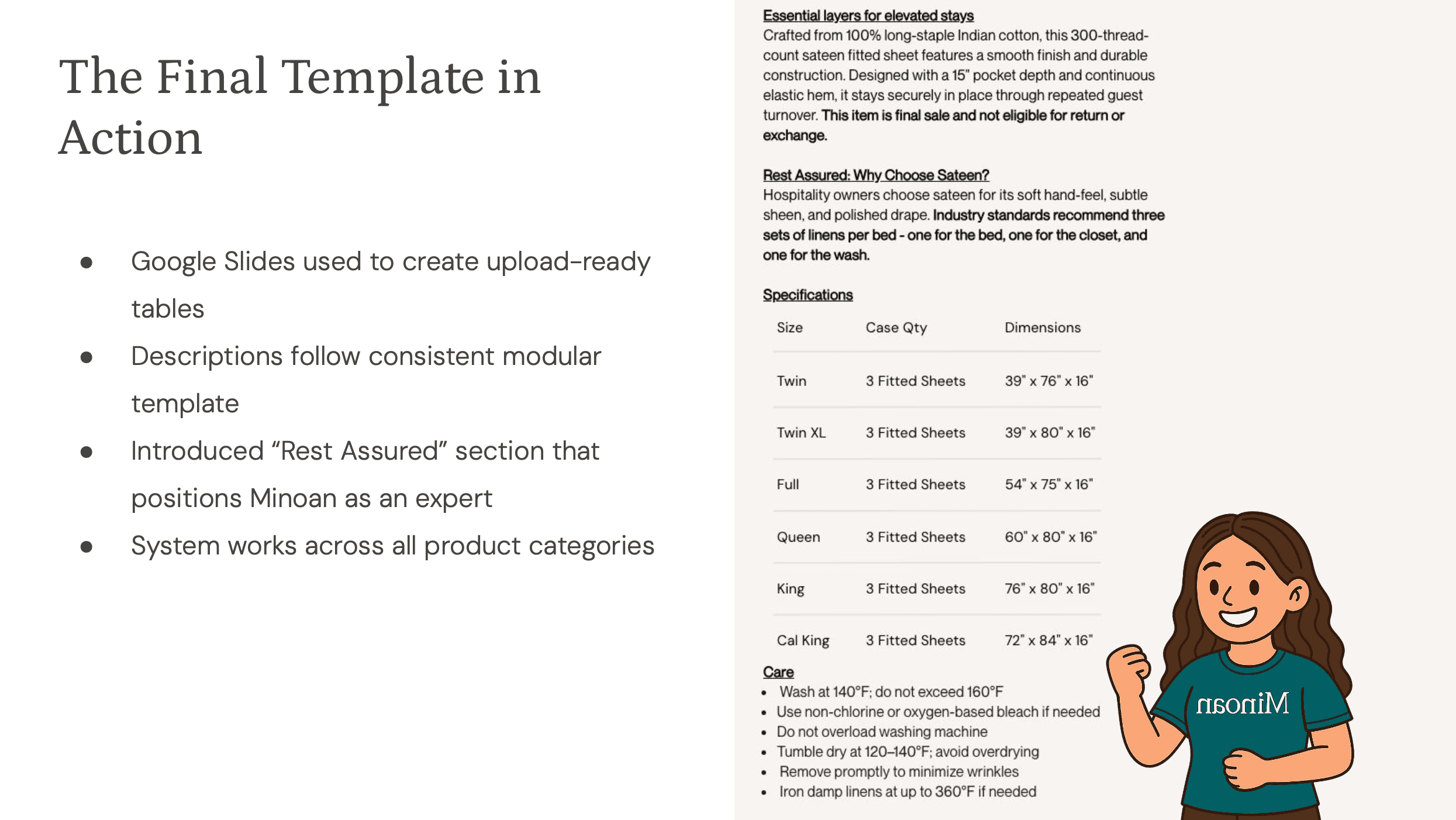 As Minoan scaled, product naming, images, and category structure were inconsistent across brands and promotions. That created avoidable friction for internal teams, increased pricing/SKU error risk during launches, and made it harder to maintain clear, consistent brand presentation across the site.